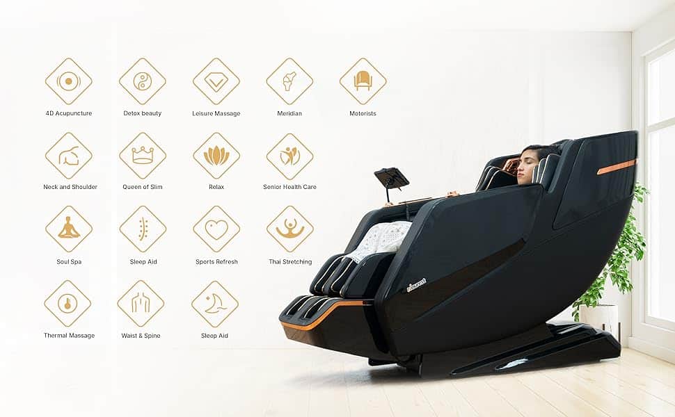 The Lion 4D Massage Chair has three separate Zero Gravity configurations designed to maximize your comfort and well-being. Whether you want to relieve stress, muscle strain, or simply relax, these ergonomic recline options have you covered. The chair’s Zero Gravity configurations effectively distribute your body weight, reducing pressure on your spine and joints. Feel the stresses of the day melt away as you recline into weightlessness, enabling for deeper relaxation and more effective massage therapy.